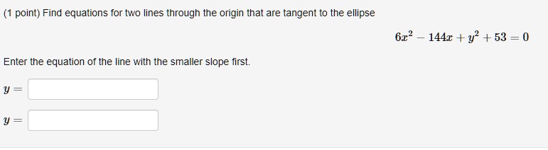 Solved Point Find Equations For Two Lines Through The Origin That Are Tangent To The Ellipse 622 144 Y2 53 0 Enter The Equation Of The Line With The Smaller Slope First